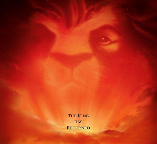 在那里,一只幼狮被高高举起,云端射出一束光将它照亮,在下面是无数朝拜的草原动物。