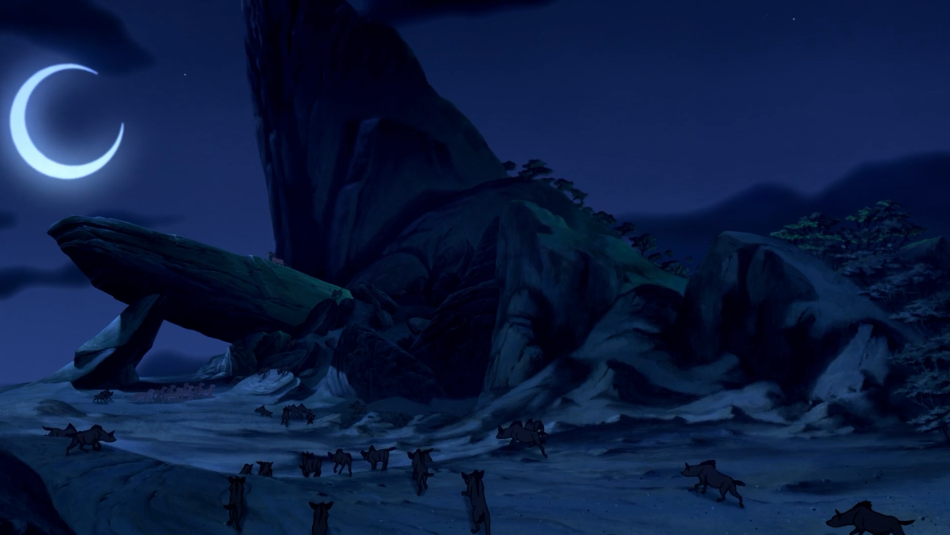 当故事推进到木法沙被设计害死,刀疤登上王位,此刻的画面设定是夜晚,一轮诡异弯钩月突兀的悬吊在天空,当镜头从荣耀石拉远,我们可以看到无数的土狼从四面八方涌入,暗示着王国的命运进入黑夜。