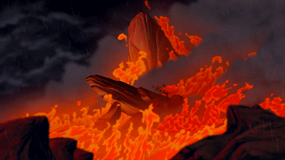 最后当辛巴回到荣耀石争夺王位时,大火预示着涅槃,雨水则象征了生机。