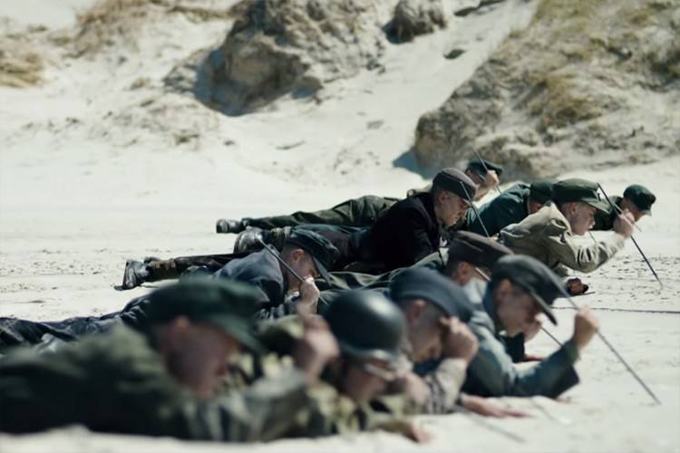 第一个画面是这样的:头戴红色贝雷帽的丹麦军士长卡尔正坐在吉普里,看着一长列准备被押送去扫雷的德军俘虏从他面前匆匆走过。