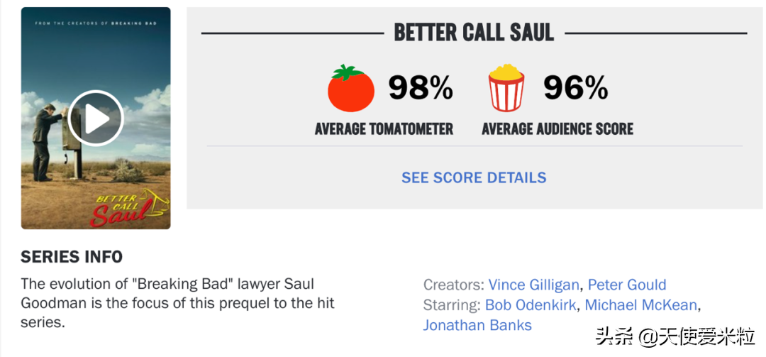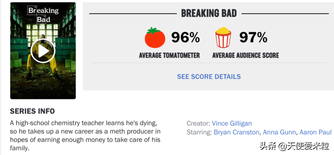 当年5季《绝命毒师》拿下16座黄金时段艾美奖,烂番茄平均96%,可谓玉珠在前。
