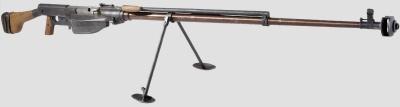 ptrs-41是前苏联在二战期间研制并列装的一支反坦克枪。该枪的五发弹仓从下方装入机匣,也可以从上方手动装入单发弹药。ptrs-41利用火药燃气实现半自动操作,然而沾污后容易卡壳,14.5mm 弹药发射后的大量残渣也容易堵塞导气孔。该枪配用的14.5x114mm 弹药枪口初速为1012 m/s,并拥有良好的弹道特性,在100米距离上最大穿甲能力为40mm。