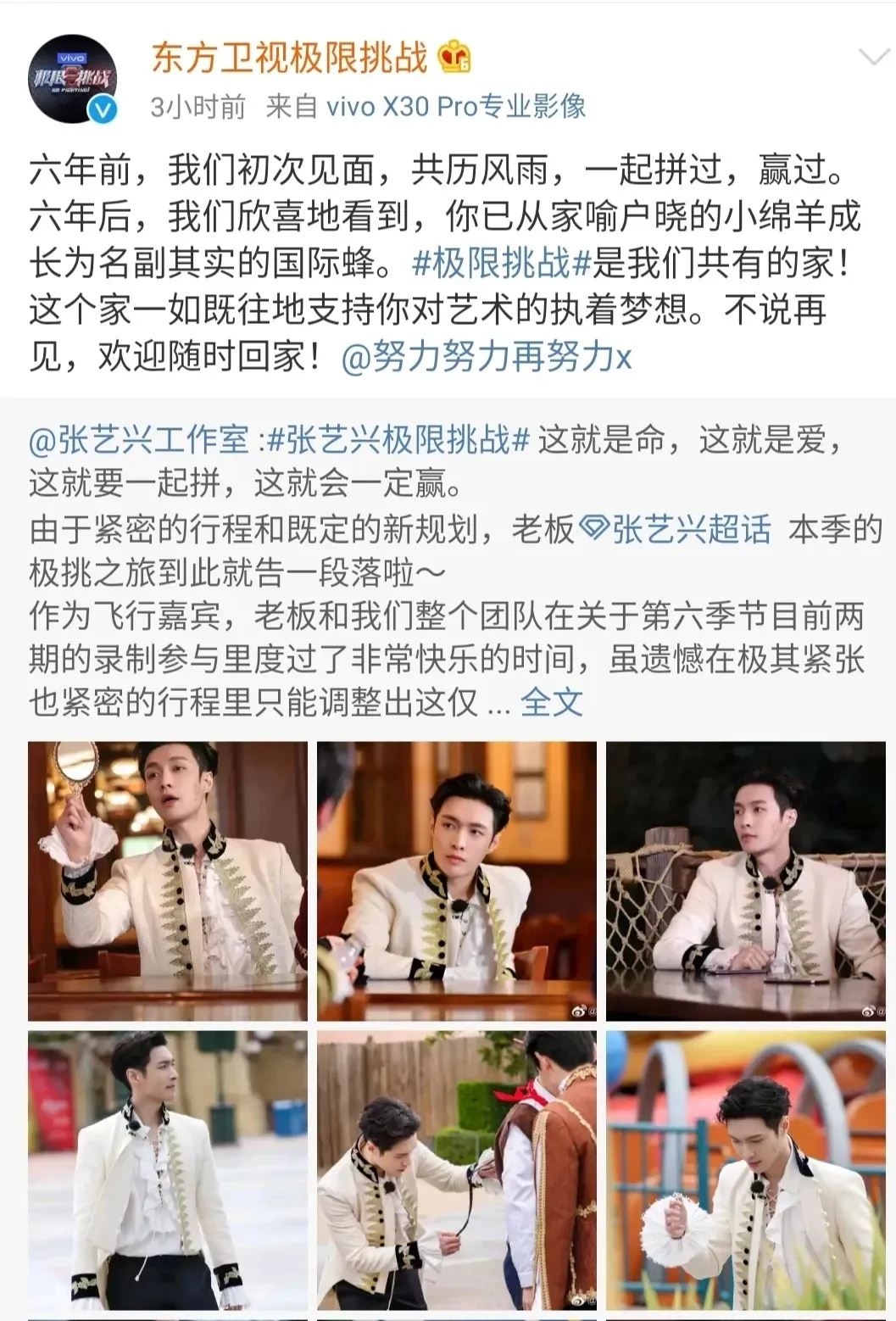东方卫视《极限挑战》第六季播出第二集后,张艺兴工作室正式发文,因为行程和规划问题,张艺兴终告别极限挑战。