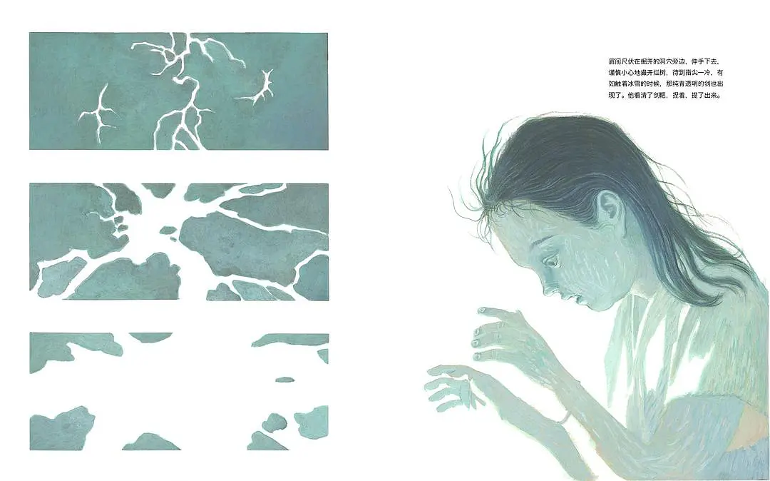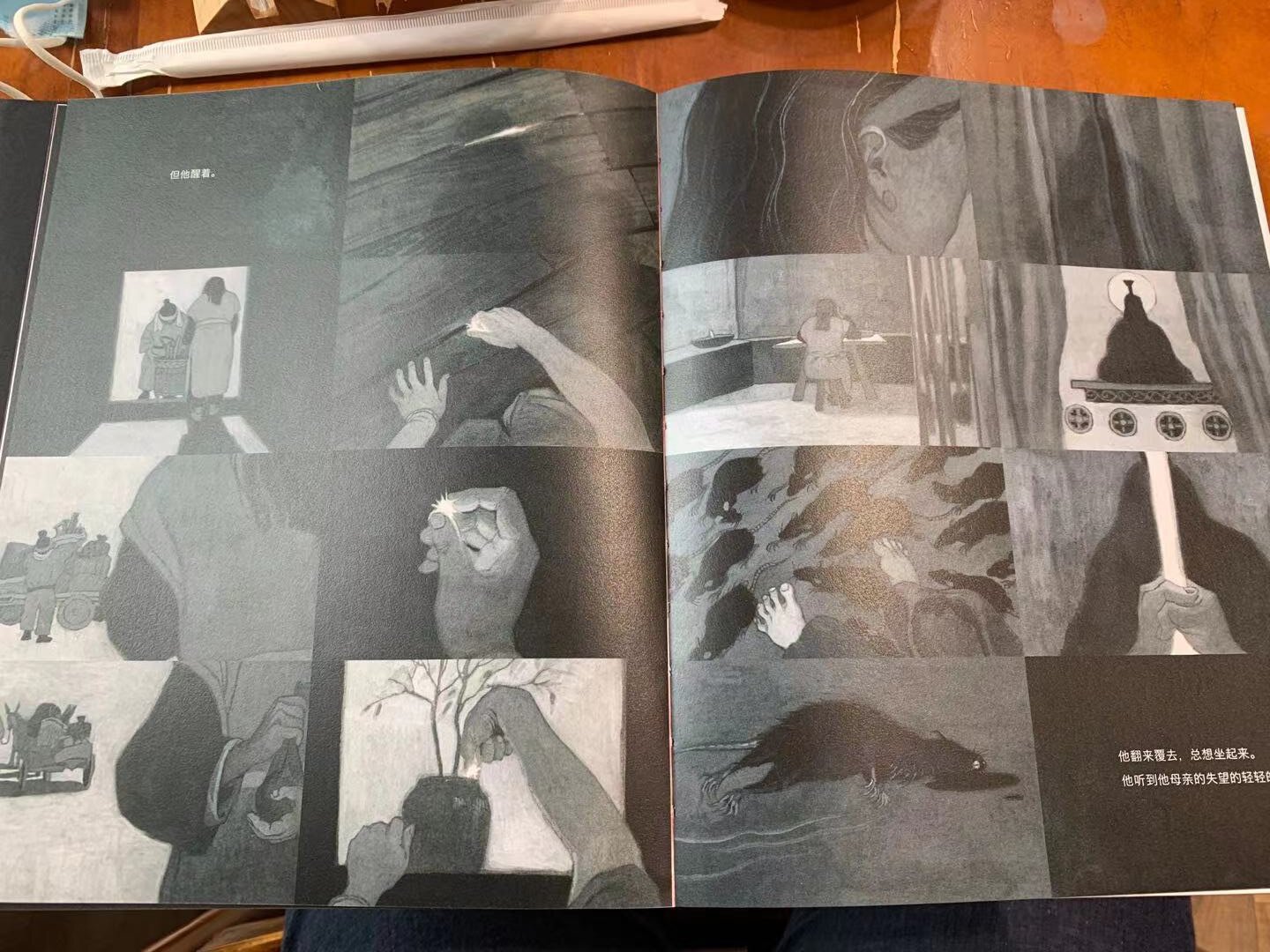在昔酒的绘本中,特意在此处增加了8组分镜,展开册页的一瞬间令人深感震撼:
