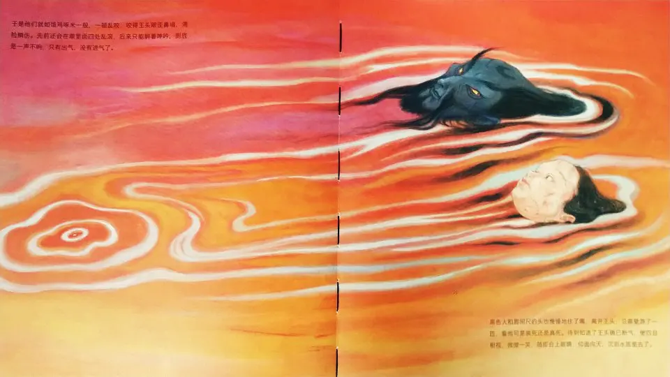 仇人相见,本来格外眼明,况且是相逢狭路。王头刚到水面,眉间尺的头便迎上来,很命在他耳轮上咬了一口。鼎水即刻沸涌,澎湃有声;两头即在水中死战。约有二十回合,王头受了五个伤,眉间尺的头上却有七处。王又狡猾,总是设法绕到他的敌人的后面去。眉间尺偶一疏忽,终于被他咬住了后项窝,无法转身。这一回王的头可是咬定不放了,他只是连连蚕食进去;连鼎外面也仿佛听到孩子的失声叫痛的声音。