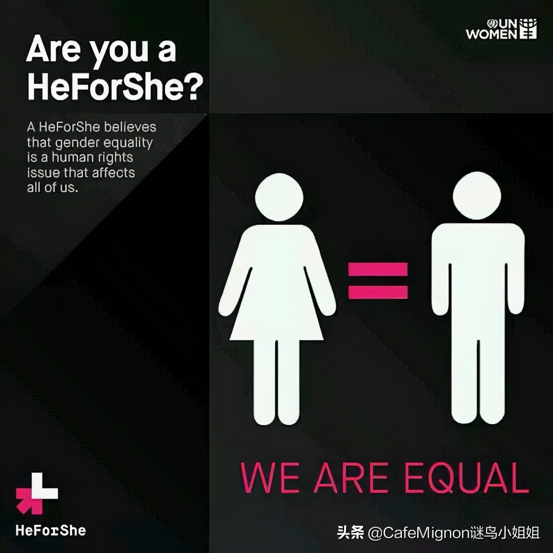 这是世界没有一个国家敢说已经实现了性别平等。联合国女权主义发起的这场“he for she”运动,持续很多年,在两周年的时候著名影星艾玛沃森还作为大使进行了慷慨激昂的演讲。