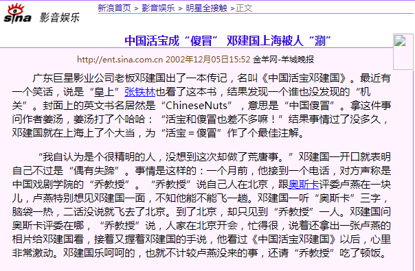 一天,我正在写一篇稿件,邓建国突然打来电话,说你赶紧写篇稿件,说张铁林骂我是中国“傻冒”。我问是怎么回事,他说张铁林是英国籍的演员,英文水平很高。不久前邓建国向张铁林送了一本《中国活宝邓建国》,张铁林看到封面上有“chinese nuts deng jian guo”的字样,就说英语里没有“活宝”一个词,“nuts”是傻冒的意思——你哪是中国活宝,是中国傻冒呀!