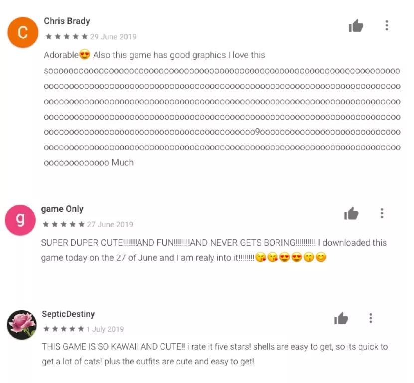 我们知道我们的玩家大约80%都是女性,但是这一数据并不能够帮助我们了解她们同时能够和她们保持沟通,此时我们会从玩家评论入手,我们的评论一般不会是”这款游戏设计非常不错,玩家不错,玩的很开心“我们的画风一般是”噢,我太喜欢这款游戏了,太可爱了,然后是很多的表情。“