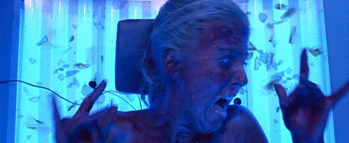 《死神来了3》其中这一幕真的超恐怖,两个去做日光浴的妹子就这样被烧死在机器里,尤其空间这么小,根本无法逃出去啊!