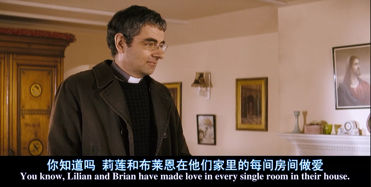 电影主角之一是大家熟悉的“憨豆”,不过在这一部影片里,“憨豆”没有常规憨豆系列电影中的那种大家熟悉的搞笑形象,反而饰演一位单调无趣的牧师,尽管我们一看到他就是感觉好笑。另外随便说一句,我还看过一部“憨豆”不搞笑的电影——《梅格雷的亡者》,剧中“憨豆”饰演一位警察局长,这部侦探电影一点也不搞笑,但无论如何,看到他还是有一种想笑的感觉。我想“憨豆”这个被人们记不清真实大名的英国演员,本来应该戏路很广,但被“憨豆”这个超级搞笑的成功形象牢牢禁锢了,全世界都认为这是一张搞笑的脸,这是悲还是喜呢?不过据说“憨豆”是一位博士,演电影只是他的业余爱好,如果是这样的话就算了。