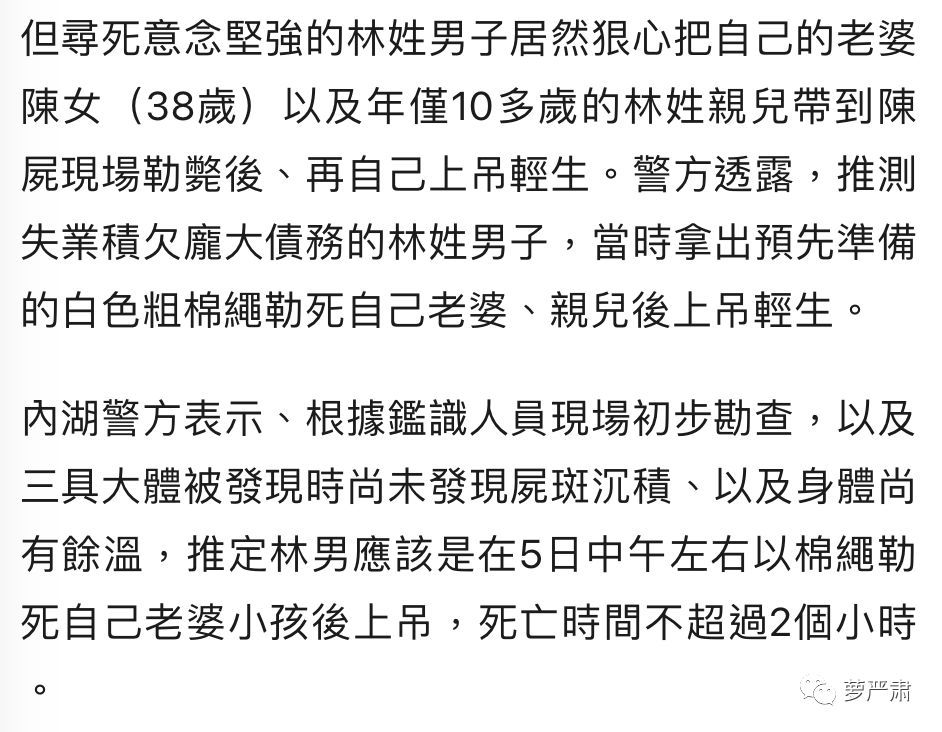 根据当地警方推定,该林姓男子把妻儿带到现场勒死后自己上吊。