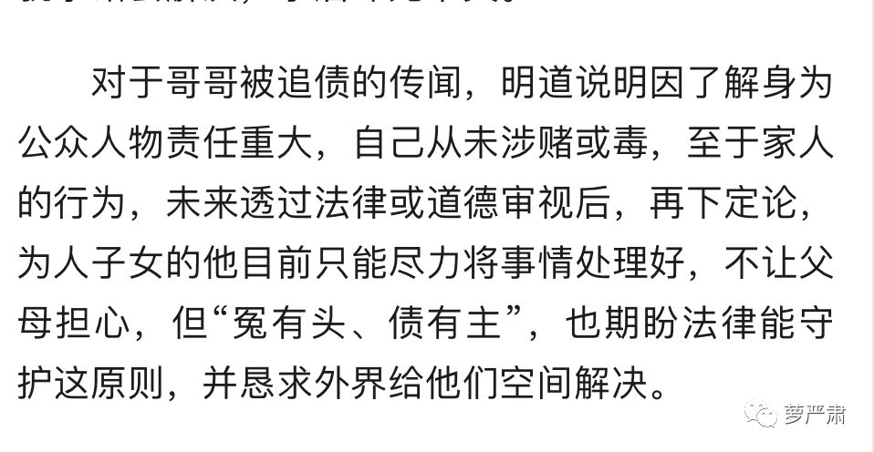 那位债主接受采访表示,明道哥哥带着妻儿躲债太过分,要么明道找哥哥出来,要么明道还。而台湾律师的解读是,被冒名借债,明道不用替兄还债。