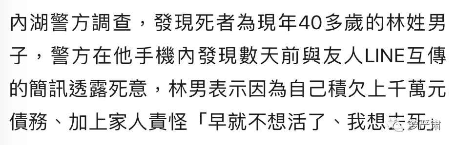 之所以会发生这种惨剧,就是因为明道的哥哥林某欠了上千万新台币的债务(一千万新台币约合230多万人民币),无力归还,还被家人责怪,因而说:“早就不想活了,我想去死。”
