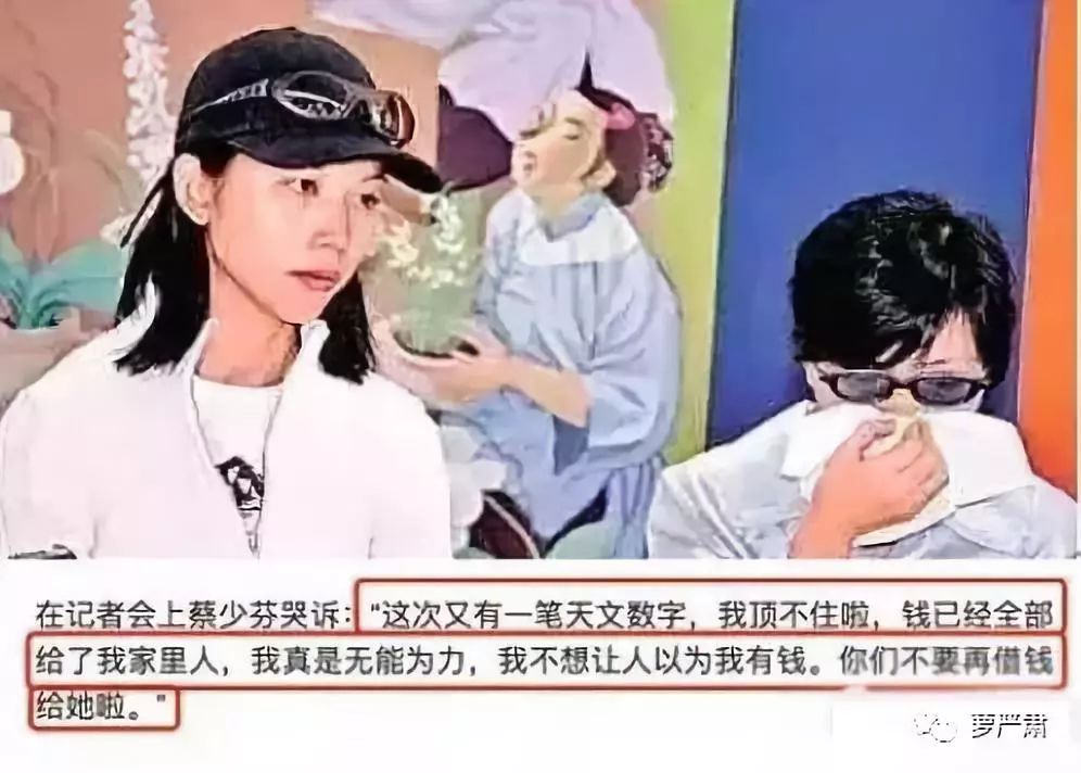 新闻报道里记载着这样的蔡少芬发言:“我顶不住啦,钱已经全部给了我家里人,我真是无能为力。其实好久之前已经帮妈妈还过好多赌债,所有收入都给了她,三年前我已经抵押了两层楼还债,以为可以偿还所有的债务,但刚刚知道还有好多,大到超过500万的天文数字,我好怕,我真是无能为力呀。”