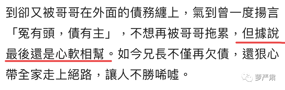 而尽管2013年和2016年的哥哥欠债风波中明道都表态不介入,但根据台湾媒体报道,明道可能还是心软出面帮忙了。