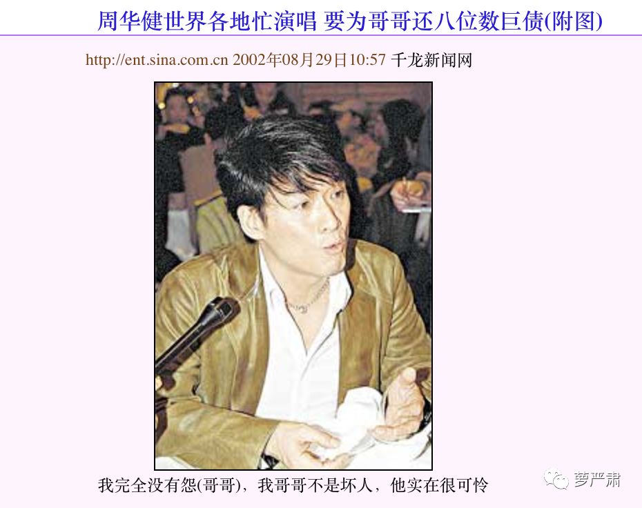 2006年周华健因为哥哥的债务案上庭答辩,说自己为哥哥的事业做担保人,在香港的半山豪宅也卖掉还债。哥哥很多次用钱都不问周华健,卖周华健名下物业去还债周华健过了半年才知道。