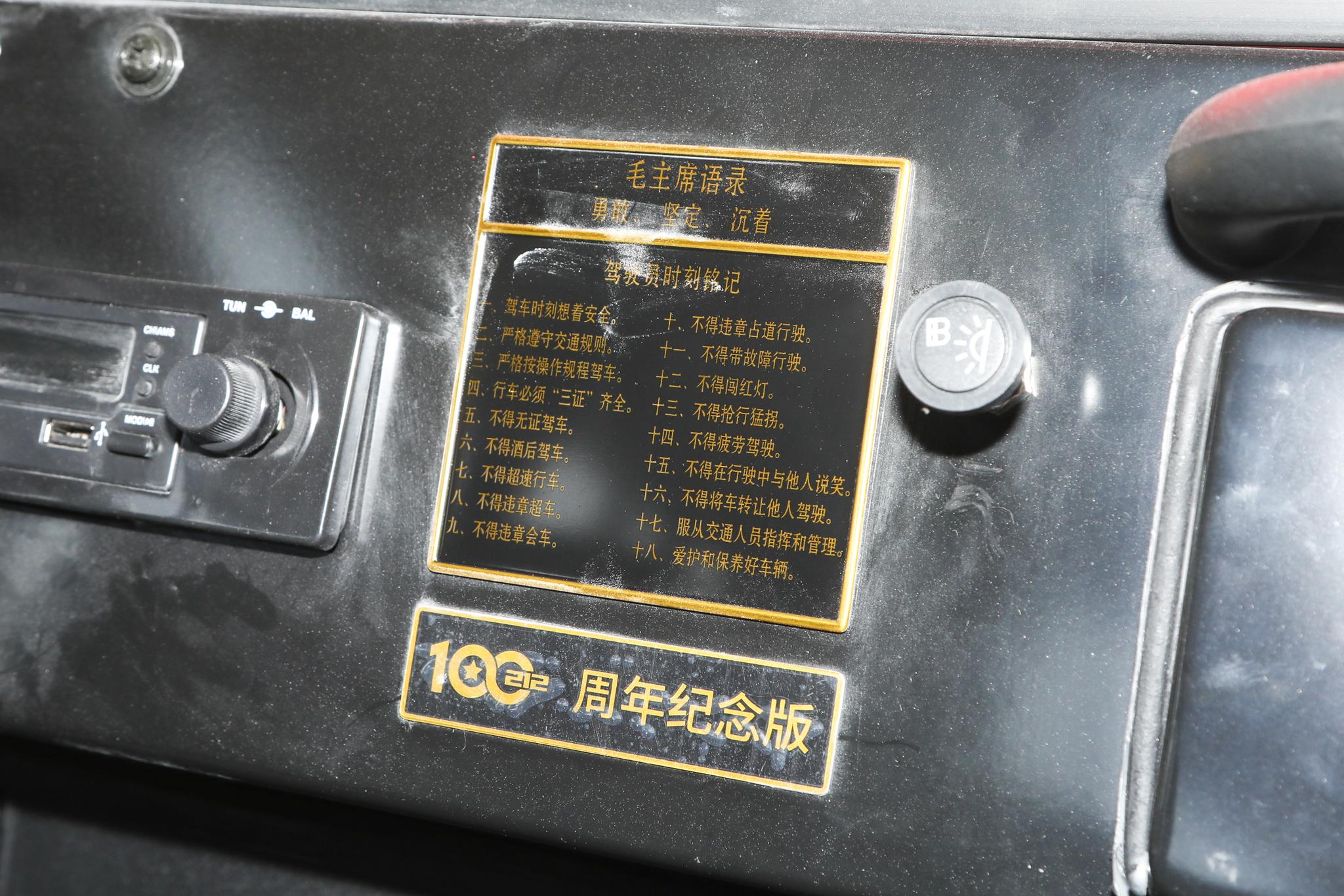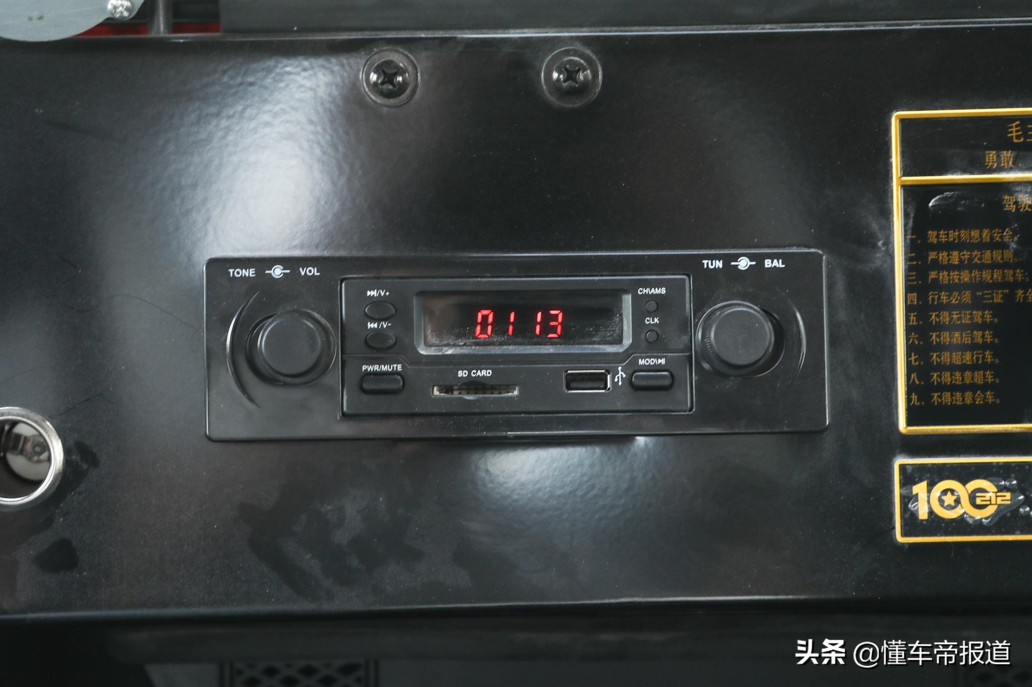 作为bj 212百年纪念致敬版内饰专属装备,该车配备有白色缝线的皮质包裹座椅和车尾电源输出接口。作为内饰仅有的科技感体现和娱乐配置,这款车配备有单色行车电脑显示屏、收音机、一个usb接口和sd卡槽。