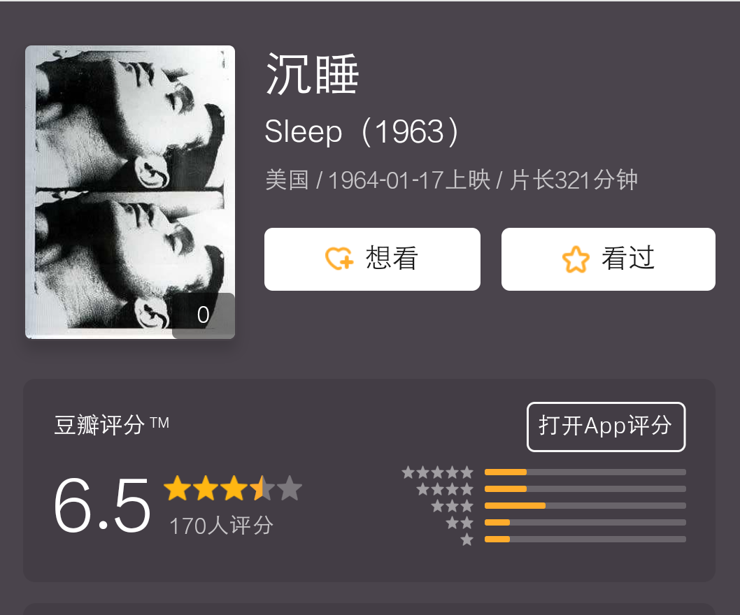 而奇葩之处就在于,这部电影总共拍了6个小时,最后上映的时长是322分钟,所有的剧情就只有一个,看着这哥们睡觉,没错,就是这样的。