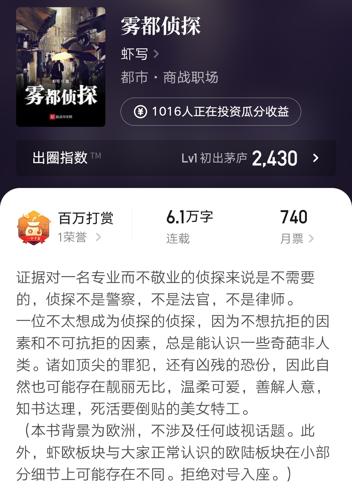 ?虾写的小说更多涉及商战、侦探推理等专业领域,不但专业性强、高智商系数,文笔也是无需质疑的。这次新书《雾都侦探》,六成字登上起点签约榜首,这阵势有点不同寻常啊!