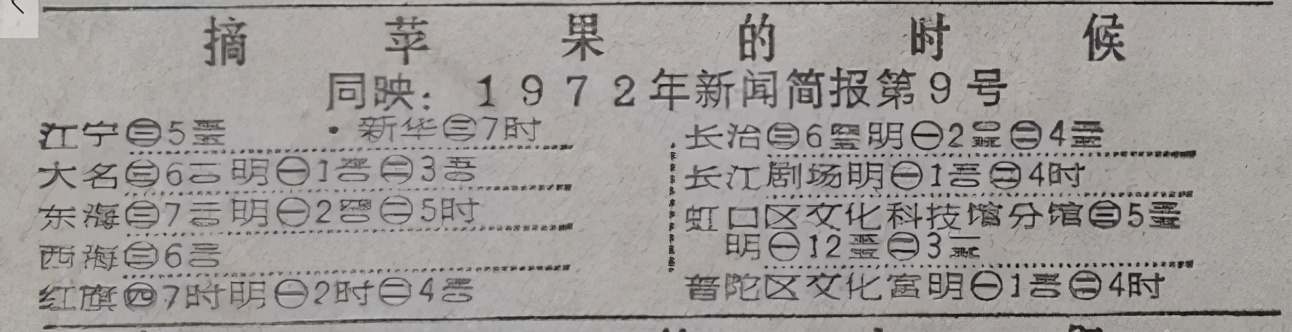 我们在《解放日报》的排名广告中,可以看到最大的标题、排片影院达到九家的一部故事片,是朝鲜电影《摘苹果的时候》,这部影片是1972年译制的最新朝鲜影片,所以对观众的新鲜度可以称得上是比较浓烈的。