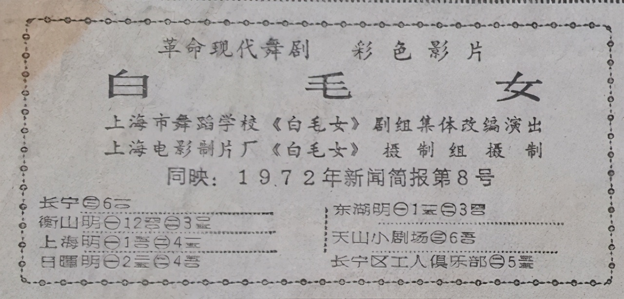 排在第一位的是芭蕾舞电影《白毛女》,与之并列放映的是中央新闻纪录电影制片厂摄制的三合一电影“钢琴伴唱《红灯记》、钢琴协奏曲《黄河》、交响音乐《沙家浜》”。