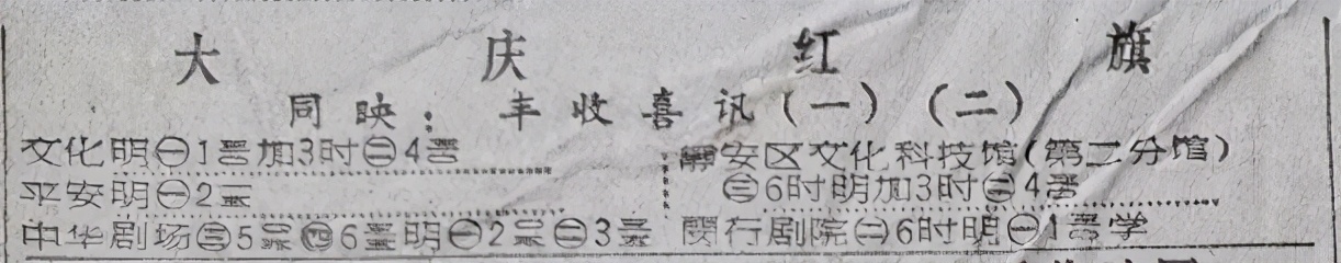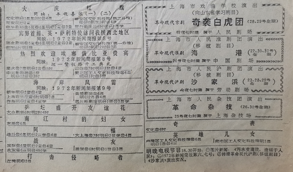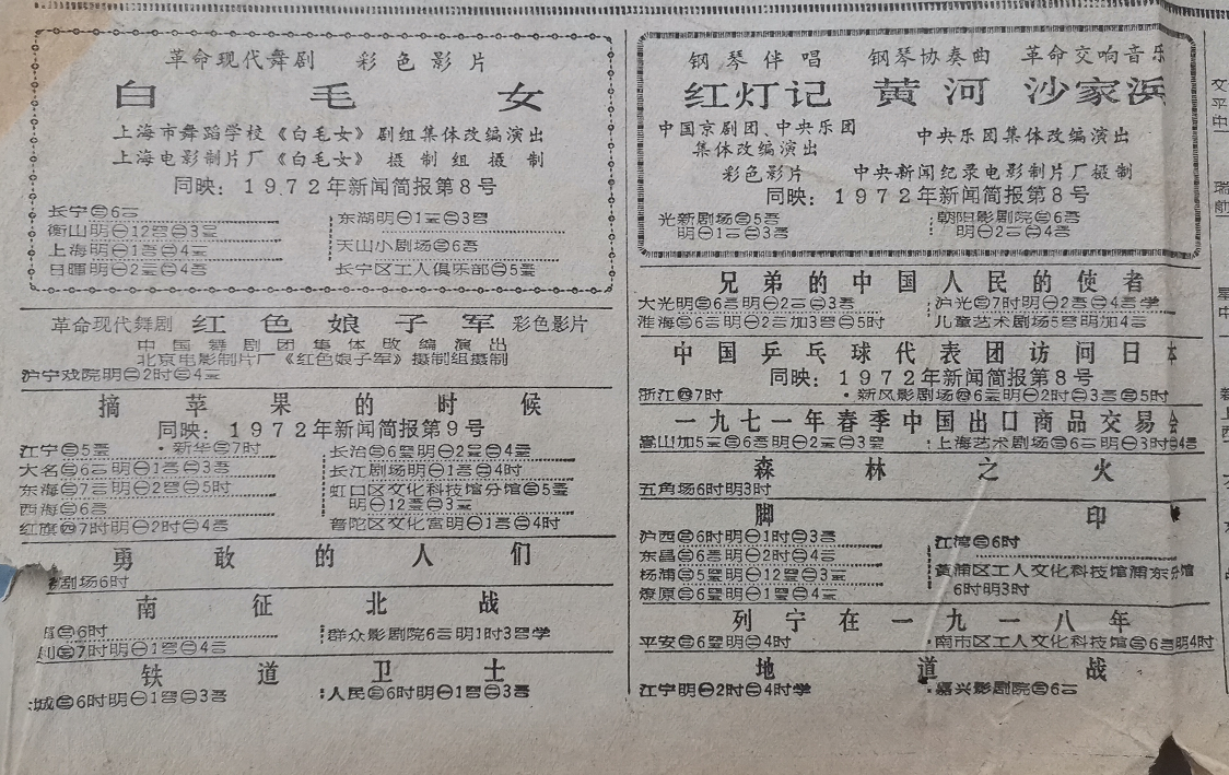 最近笔者在家里的旧报纸堆里,找到了一张1972年3月22日的《解放日报》,在它的广告栏里,布满了当时沪上各家影院的排片广告。