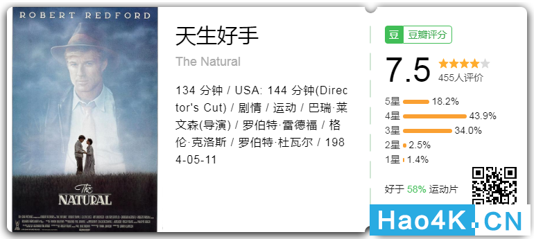 电影《天生好手》the natural (1984 )将于6月4日发布4k uhd 2160p蓝光原盘,喜欢4k原盘的朋友记得关注小编,电影《天生好手》the natural 4k原盘发布后小编第一时间给大家推送4k破解蓝光破解原盘资源!