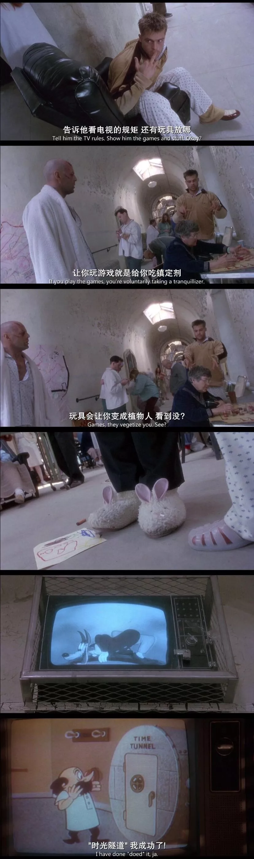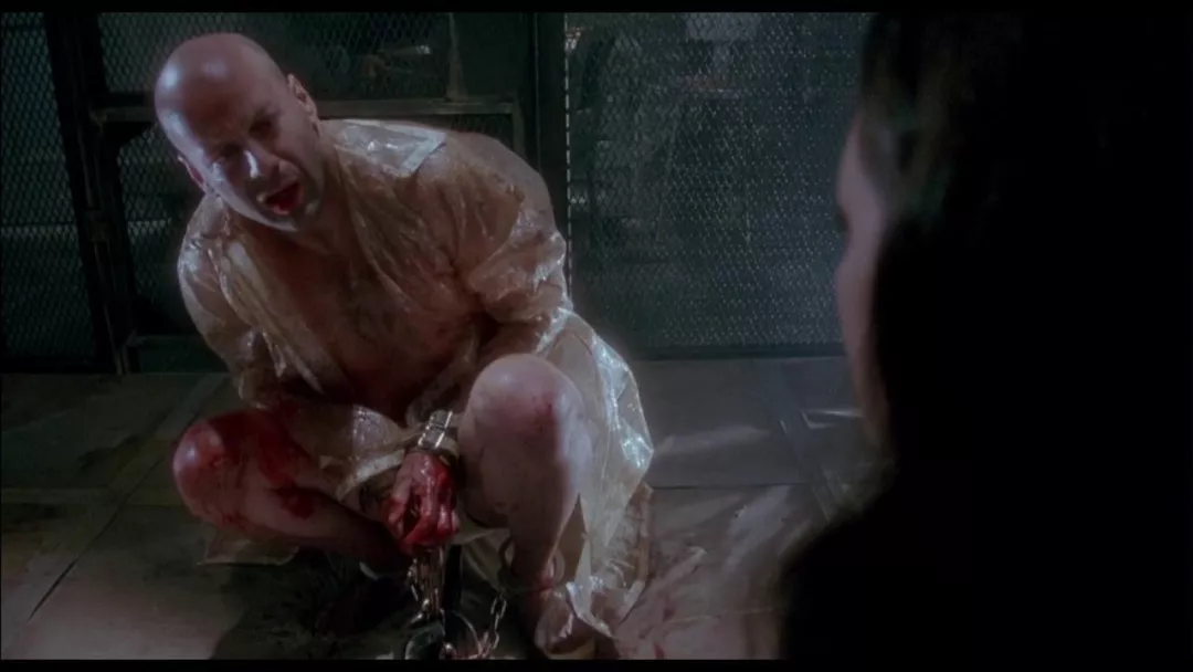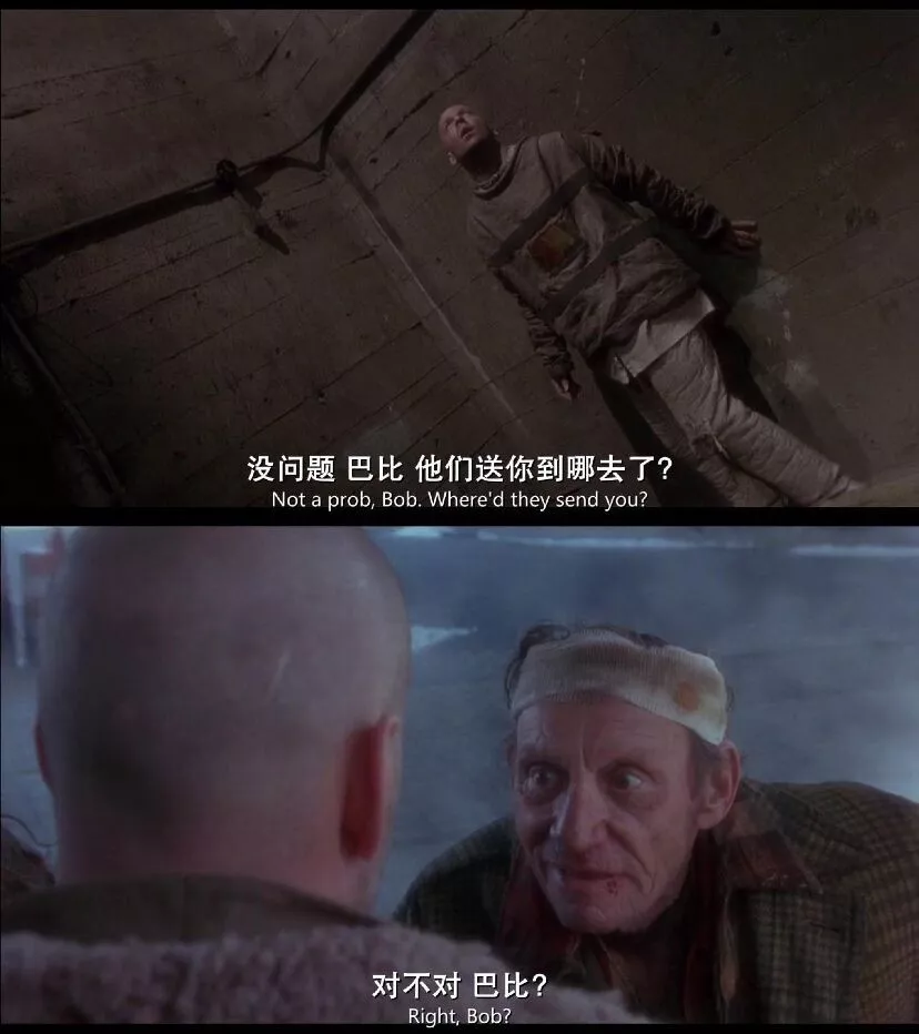 2035年科尔到地面搜集标本后回去时的消毒沐浴——1990年进精神病院时的消毒沐浴;