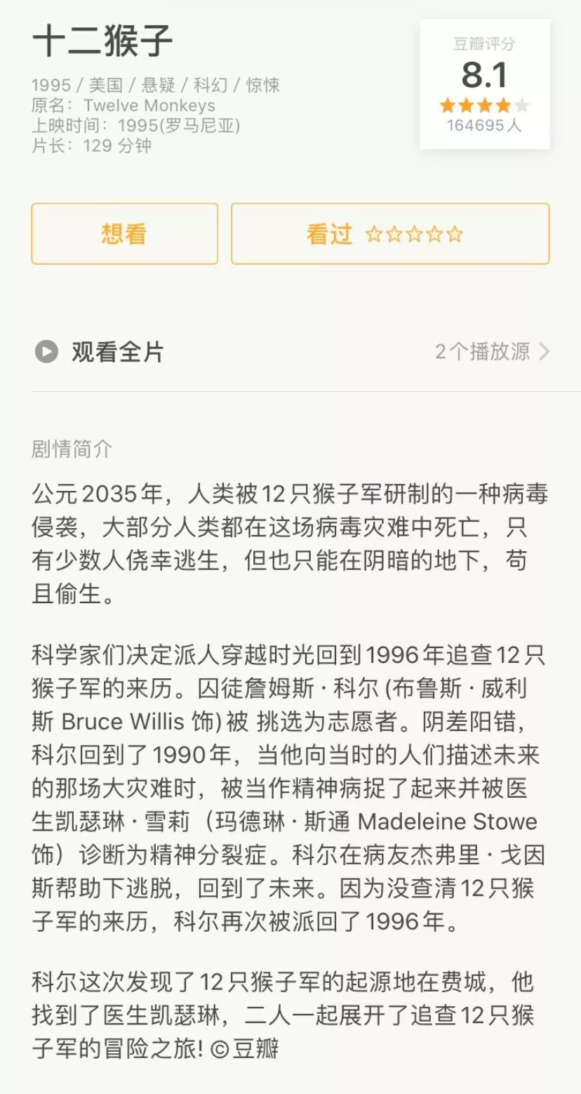 从情节(时间布局)上来看,《十二猴子》绝对是一部关于穿越的科幻电影。