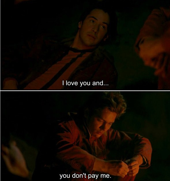 这种基于生活经验的临时表演,有时反而成为演员的高光,正如瑞凡·菲尼克斯在1991《不羁的天空》中,自己临时添加的那句经典对白:我爱你,而你不用付我钱。