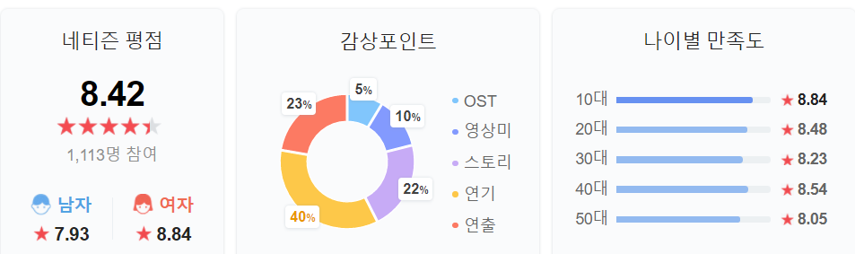 恰好,韩网naver观众8.4分的赞誉中,近40%给了全钟瑞和朴信惠的表演,近23%给了导演李聪贤。