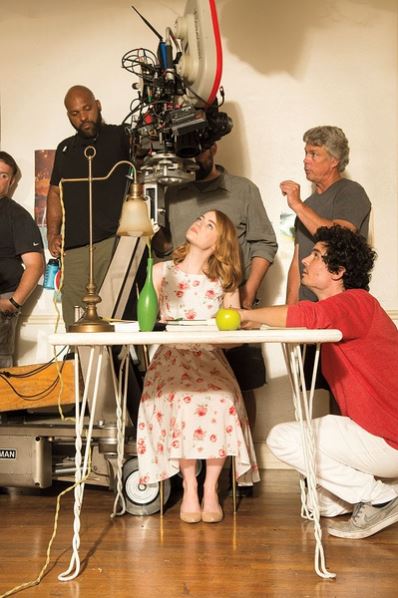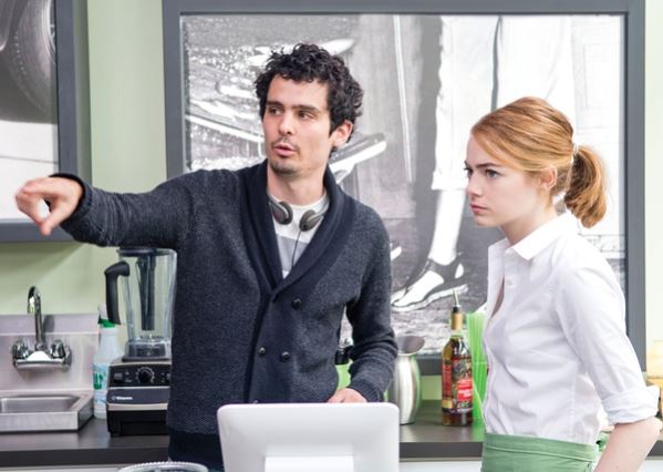 ▲达米安·沙泽勒(左)与艾玛·斯通在片场,石头姐拍百老汇的《歌厅》时两人见面促成了这次合作