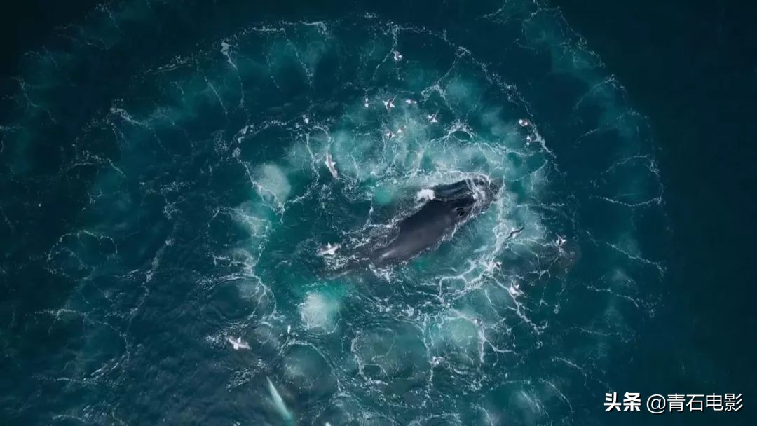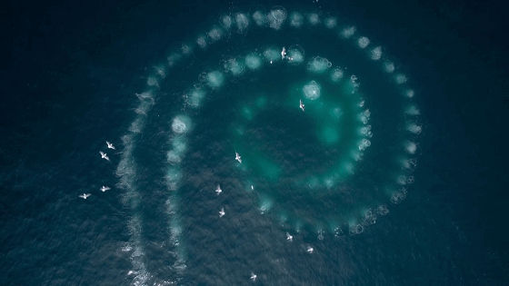 它们接连吐出的气泡,编织出一道磷虾无法穿越的气泡网。随后座头鲸向内螺旋上升,将磷虾群收拢集中。