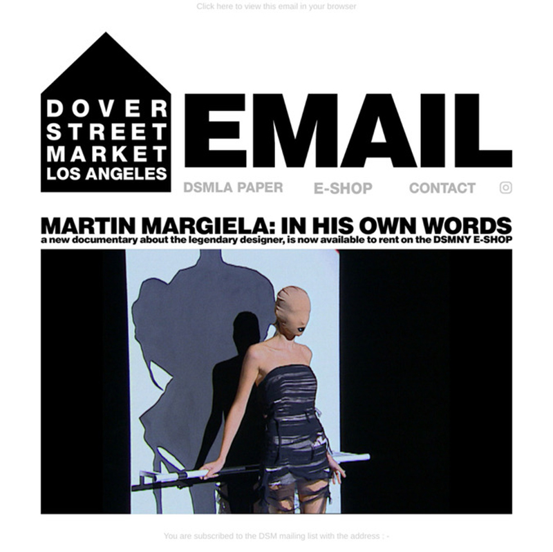 除了时尚爱好者们所熟悉的 dover street market,坐落在美国旧金山的男装买手店 the archive, 芝加哥的 esthete 画廊、rsvp 画廊以及长期售卖 martin margiela 时期服饰的古着电商 resurrection vintage 都成为了发行伙伴,均在官网加入关联链接,让时尚受众们得以方便地跳转至纪录片的付费观看平台,当注册账号并采用信用卡付款 12 美元后,便可在 72 小时之内任意点击观看了。