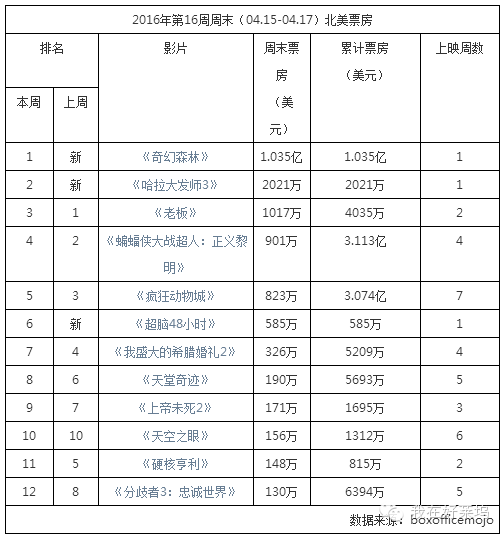 上周末(04.15-04.17)北美大盘共计收入1.74亿美元,在迪士尼新片《奇幻森林》的强力拉动下,较前一周上涨65.6%。迪士尼接档《疯狂动物城》的《奇幻森林》同样有“神片”潜质,开画首周口碑逆天人气爆棚,在北美本土拿下1.035亿美元票房,这周末结束后全球票房已经达到2.9亿美元。被北美影评称赞为迪士尼最好的真人改编电影:“一部努力避开人类的电影,却充满着人性的光芒。”