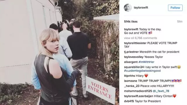 在2016年,特朗普和希拉里的那场“世纪大战”中,taylor虽然号召自己的粉丝去投票,甚至站在投票屋前还发布了网络动态,但仍然对自己的政治倾向缄口不言。