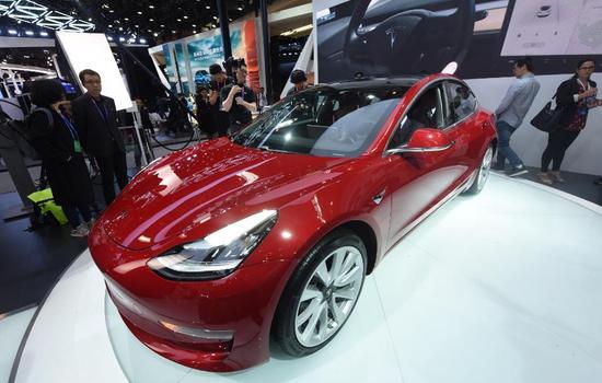 图:2018年4月25日,中国国际展览中心展出的特斯拉model 3汽车,它的动力与许多消费电子产品中的锂离子电池技术相同