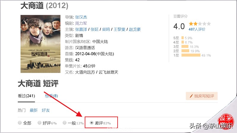 本来凭着“二张”(张嘉译、张延)在影视圈的好口碑吸引到了无数的观众前来围观、追剧,结果却因糟糕的剧情招来无数骂声,吐槽三观不正之声不绝于耳。在专业的影视剧评分平台豆瓣上,这部戏的得分是一路下滑,从开始的4.3已经滑至4.0,目测还可能会滑至3.5以内。值得一提的是,为这部戏打出好评(4、5星才算是好评,3星仅是及格)的观众占比仅有12.6%,而在短评里,差评占比达到了82%。看来,即便是近年来人气高涨的实力派张嘉译也无法挽救这部戏的烂口碑。
