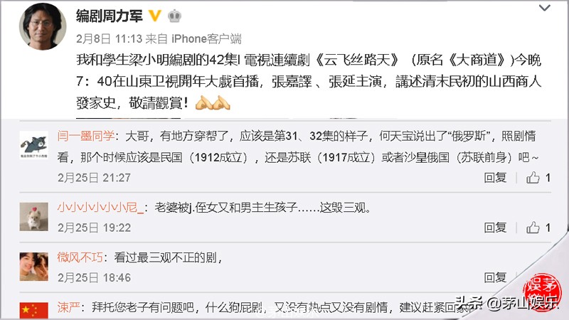 对剧情强烈不满的网友,除了在豆瓣上为这部戏打上差评外,还有不少网友跑到这部戏的编剧周力军的微博下吐槽。在这部戏更名重播当天,编剧周力军特意在自己的微博上向网友安利该剧,估计他做梦也想不到,这条微博下评论区里翻车了,有不少观众揪出剧中穿帮的地方,还有观众吐槽这部戏的三观不正。针对观众的这些吐槽,周力军本人没有再回应了。