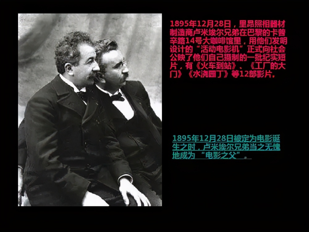 电影诞生于1895年。是年12月28日,“世界电影之父”卢米埃尔兄弟拍摄的《火车进站》等片的公开放映,标志着电影的正式诞生。