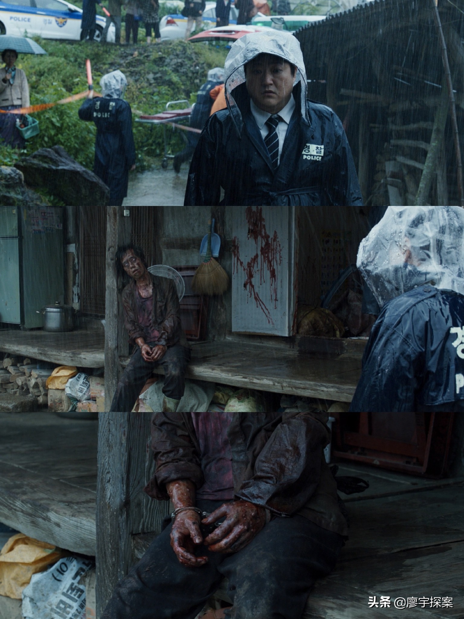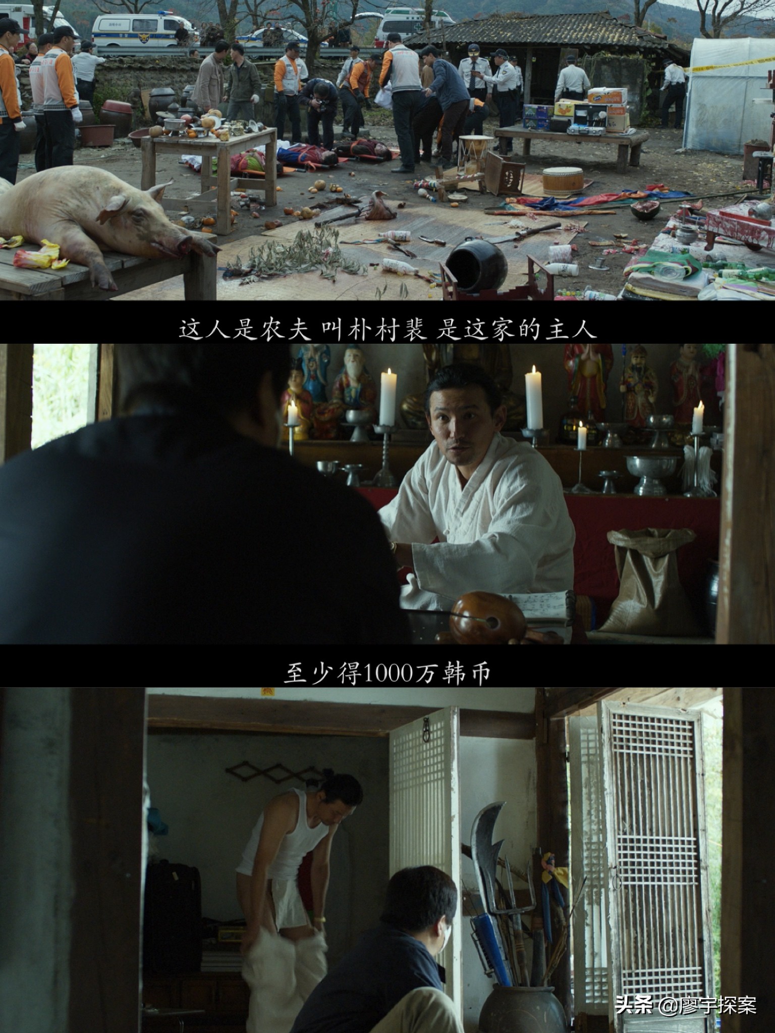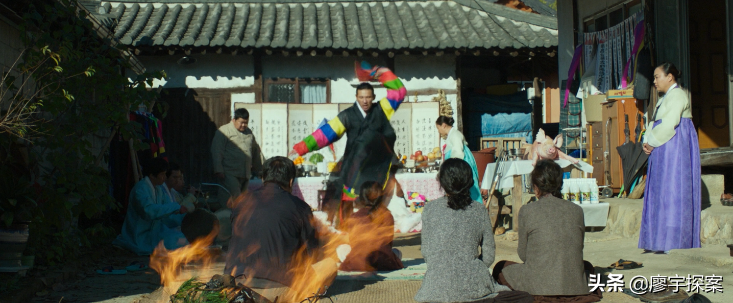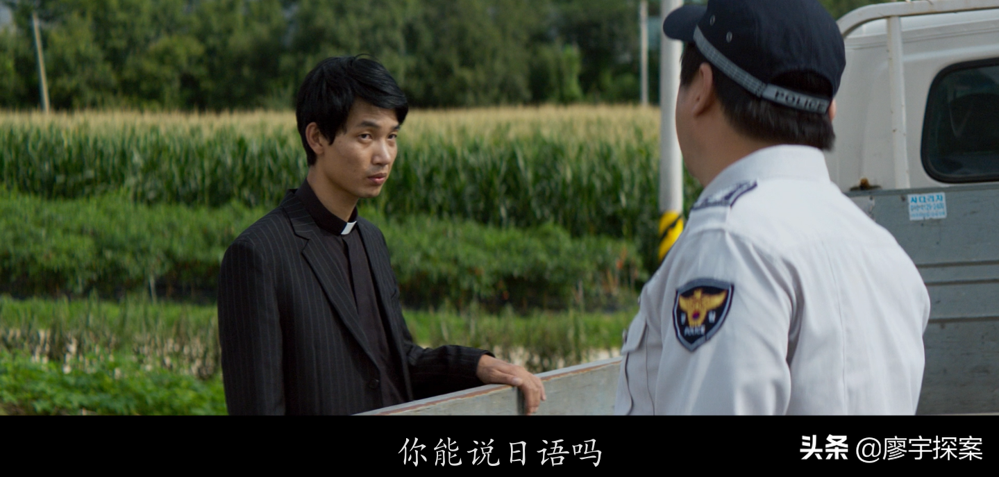 下面创作者用一组镜头语言告诉观众萨满教巫师日光到底是什么身份和目的。在钟久家驱魔后马上衔接了村里的第三起惨案和第五个恶魔的傀儡朴春裴。从案发现场看这家人同样是找了萨满教巫师来驱邪,但结果是没任何用,男主杀了全家人后失踪。接着是萨满教巫师日光说“日本佬”是个很厉害的鬼,需要1000万韩元(大约58000rmb)才能处理,最后萨满教巫师日光换衣服时我们看到他与“日本佬”穿的是同样的“越中禈”。