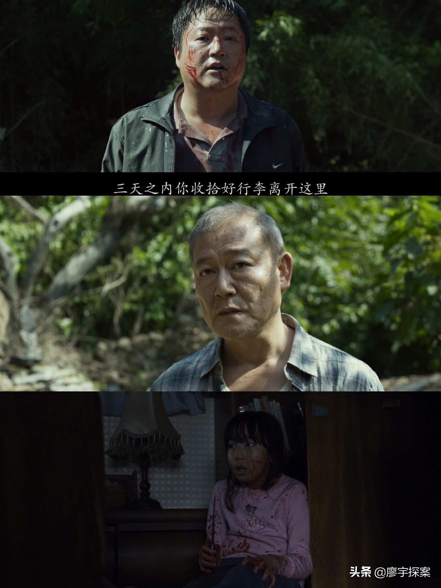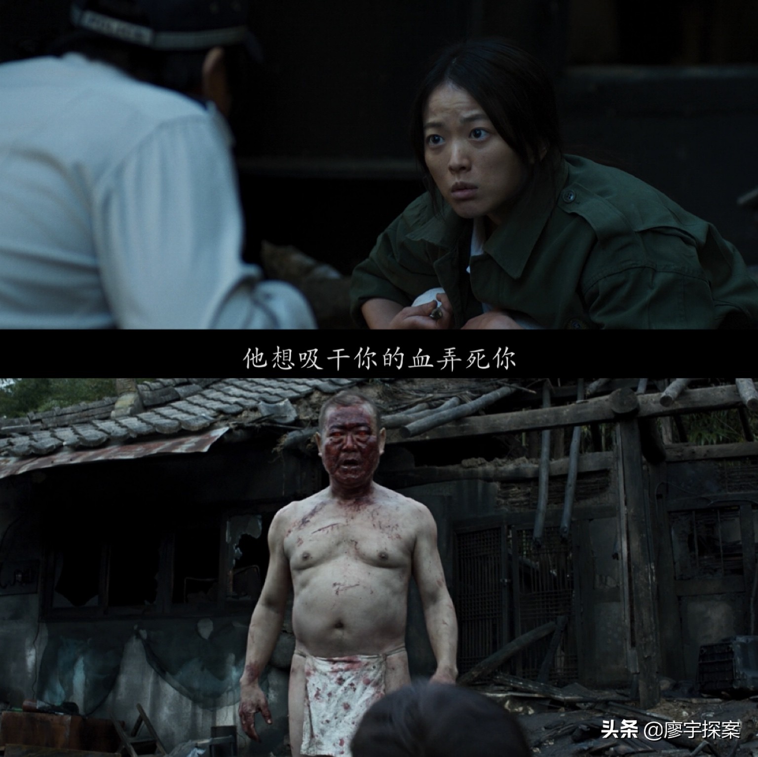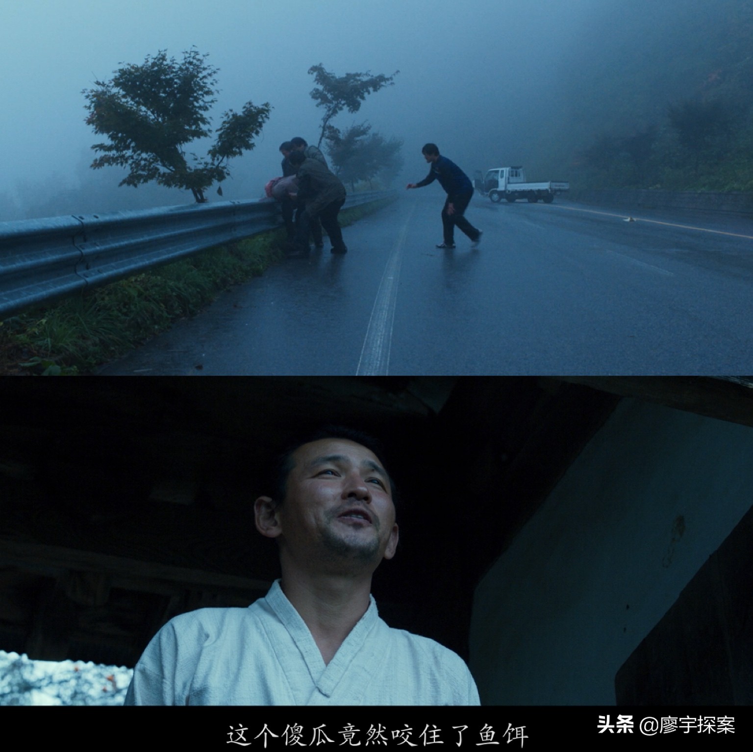 下面创作者用一组镜头语言告诉观众萨满教巫师日光到底是什么身份和目的。在钟久家驱魔后马上衔接了村里的第三起惨案和第五个恶魔的傀儡朴春裴。从案发现场看这家人同样是找了萨满教巫师来驱邪,但结果是没任何用,男主杀了全家人后失踪。接着是萨满教巫师日光说“日本佬”是个很厉害的鬼,需要1000万韩元(大约58000rmb)才能处理,最后萨满教巫师日光换衣服时我们看到他与“日本佬”穿的是同样的“越中禈”。