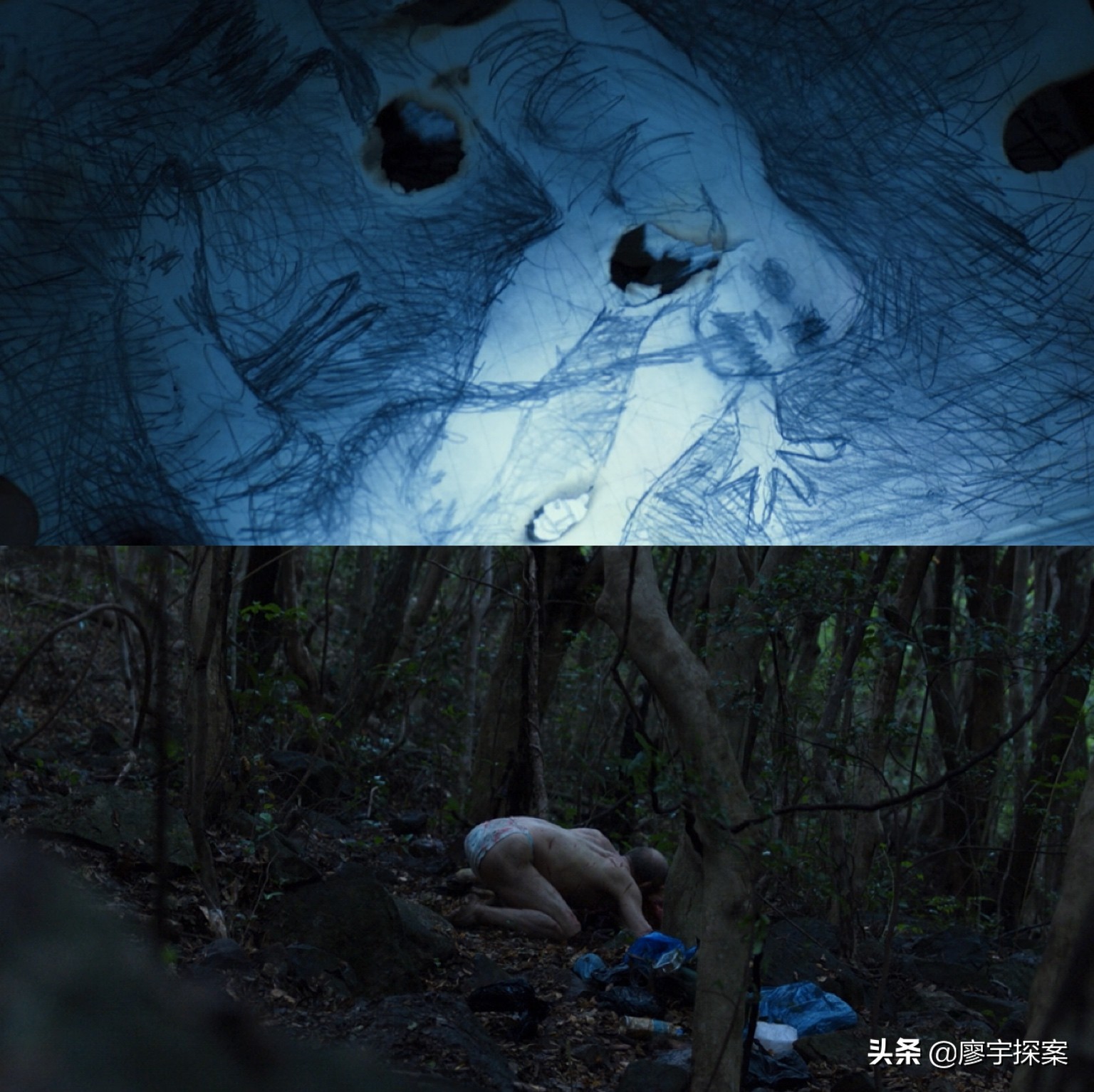 接下来将要发生的就是那场著名的“驱魔”戏,创作者再次用蒙太奇的手法让观众误认为,萨满教巫师日光给孝真驱魔是在攻击“日本佬”,而“日本佬”做法是在应对日光。而实际上日光是听“日本佬”的命令在加剧孝真的中邪,因为从他给孝真驱魔的室内与第一案形同“鸟窝”的赵氏被害现场如出一辙,都用树杈未成一个“鸟窝”。
