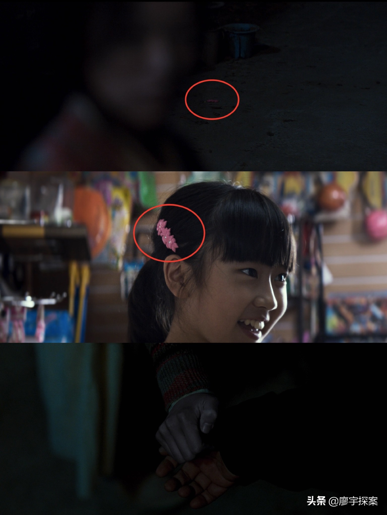 而这个人就是此刻坐在父女俩的对岸正在钓鱼的“日本佬”。这里需要注意两件道具,一是钟久给女儿买的发卡,后面会有作用,另一个是女儿吹的乐器是意大利的奥卡里纳笛,在中国叫陶笛。如果喜欢日本推理小说的朋友应该知道作家横沟正史的一本小说叫《恶魔吹着笛子来》,我猜此刻创作者的用意也正是如此吧。“日本佬”第二次下饵,饵是小女孩不该有的欲念,而这次上钩的是钟久的女儿孝真。多次偷看父母办事就是不该有的欲念,以此为筹码换取礼物更是不该有的欲念,那么这些欲念导致了孝真的x早熟,从这里开始也让我隐隐的觉得,孝真后面是被强迫也好,被收买哄骗也好。她应该是与日本佬发生了关系,后面有几点细节可以证明我的猜测。