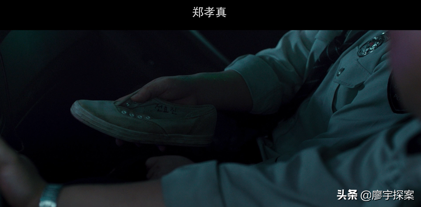 接下来在回去的路上,钟久的警察同事认为“日本佬”是用被害人的某件物品施邪术害人,并且发现了钟久女儿孝真的一只鞋,也就是上面的那只白球鞋,里面写着孝真的名字。从而证实了“日本佬”下一个要加害的正是孝真。