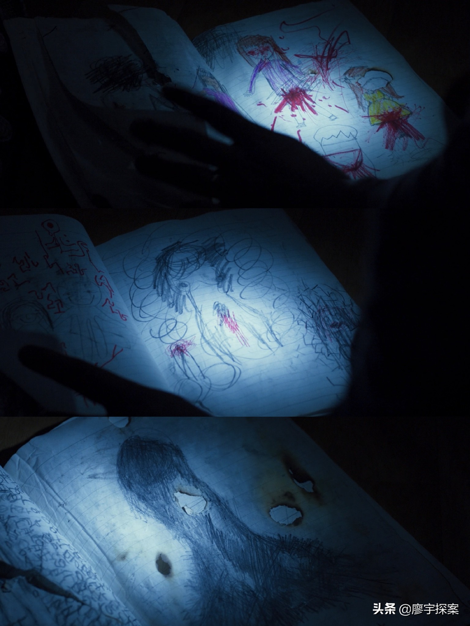 很明显这个问题触及到了孝真的痛楚,她为什么突然歇斯底里?因为作为父亲以及警察的钟久这时应该问的是:日本佬对你做了什么吗?而不是在哪里见的这个愚蠢问题。这里也显示了钟久这名村警在业务水平和知识层次上都不是很高,为后面他所作出的诸多错误选择铺垫。我们再来看看钟久晚上发现孝真在作业本上都画了些什么吧。