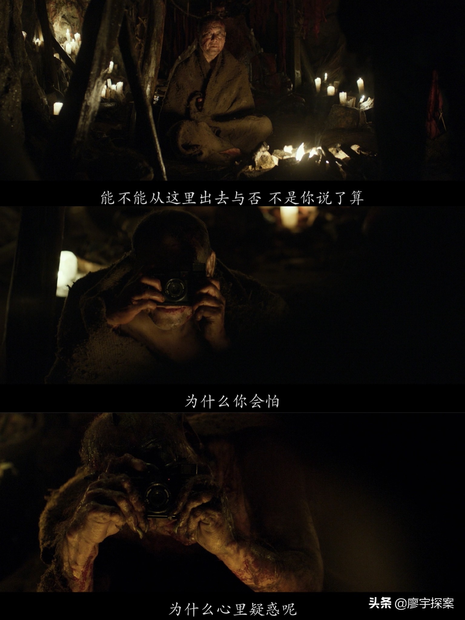 再来说说我的分析和观点,其实在本片中创作者也是用了“一语双关”的手法来迷惑观众,更贴切的说应该是“一石二鸟”。就是先在片头抛出《圣经》故事中的那段话,树立出一个“正念”。然后偏偏让“日本佬”在片尾说出此话,让人觉得他说的便是“正念”,那么他本人应该是被误解的好人,这完全是在偷换概念。甚至创作者觉得这还不够混淆视听,所以再让他展现出“圣痕”。即在片中欺骗了年轻的副祭司,同时也欺骗了观众。可谓一石二鸟!