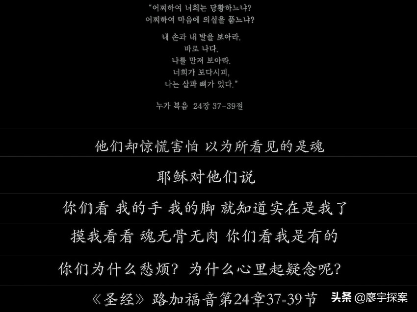 在这段情节中说的是耶稣向信徒们说明自己是真的复活了,因为魂无骨无肉,而自己是有的。那么反方以此得出的结论就是“日本佬”有血有肉所以他不是鬼。这也不怪有人这样认为,就连片中教会的牧师也是这么说的。