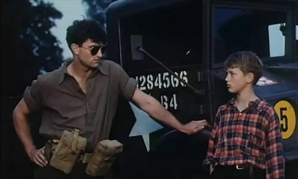 在他们初见的时候,一群美国大兵,他戴着墨镜,靠在一辆装备车上,摘下眼镜,直直地与他对望;还有那辆巡逻车,或许我称呼错了,军官开着车喂男孩吃了一颗巧克力。就是这两幕,平凡无奇,前一幕开启了他们之后的故事,后一幕把他们的关系引入了更深的地方。不约而同的是,它们都散发出了无比纯净,无比强烈的初恋感,几近是到了呼之欲出的地步。我还能想象到我当时心情突然明朗起来的样子,像是生活的一潭死水终于被打通了。