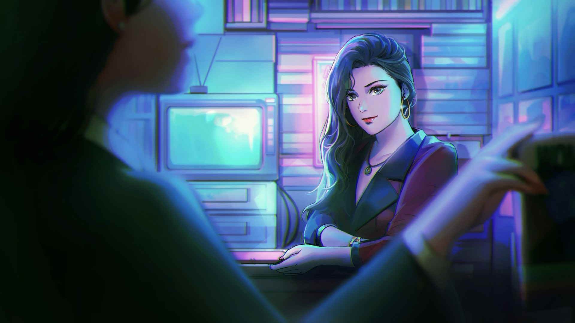 游戏采用暧昧迷幻、仿佛穿越于80年代的复古蒸汽波艺术,在ui设计上就很有这种感觉:粉红阴影的标题设计、老式电脑般的蓝屏剧情回忆、电视收不到信号节目般的存档栏位...游戏中除了大量朦胧霓虹地图场景、摩托骑乘(严谨尊重了时代背景),也会插入小段香港老式录像,许多场景闪烁出黑白电视雪花裂痕粒子,游戏完美展示了令人迷恋的怀旧文物。